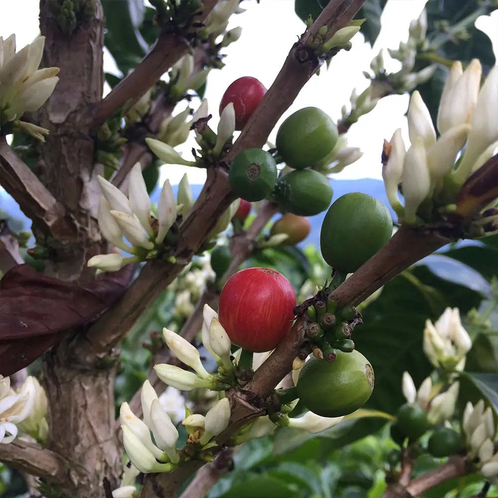 På den sin 20 hektor stora gård Villa Betulia i Acevedo Huila – som vi har köpt kaffe från och besökt flera gångar – odlar Luis Anibal Calderón en mängd olika kaffevarieteter, varav Pink Bourbon är en av dem. Varieteten är en etiopisk ursprungsvarietet och sticker ut på alla sätt – från den slående rosa färgen på de mogna kaffebären, till den sött komplexa smaken från bönorna.