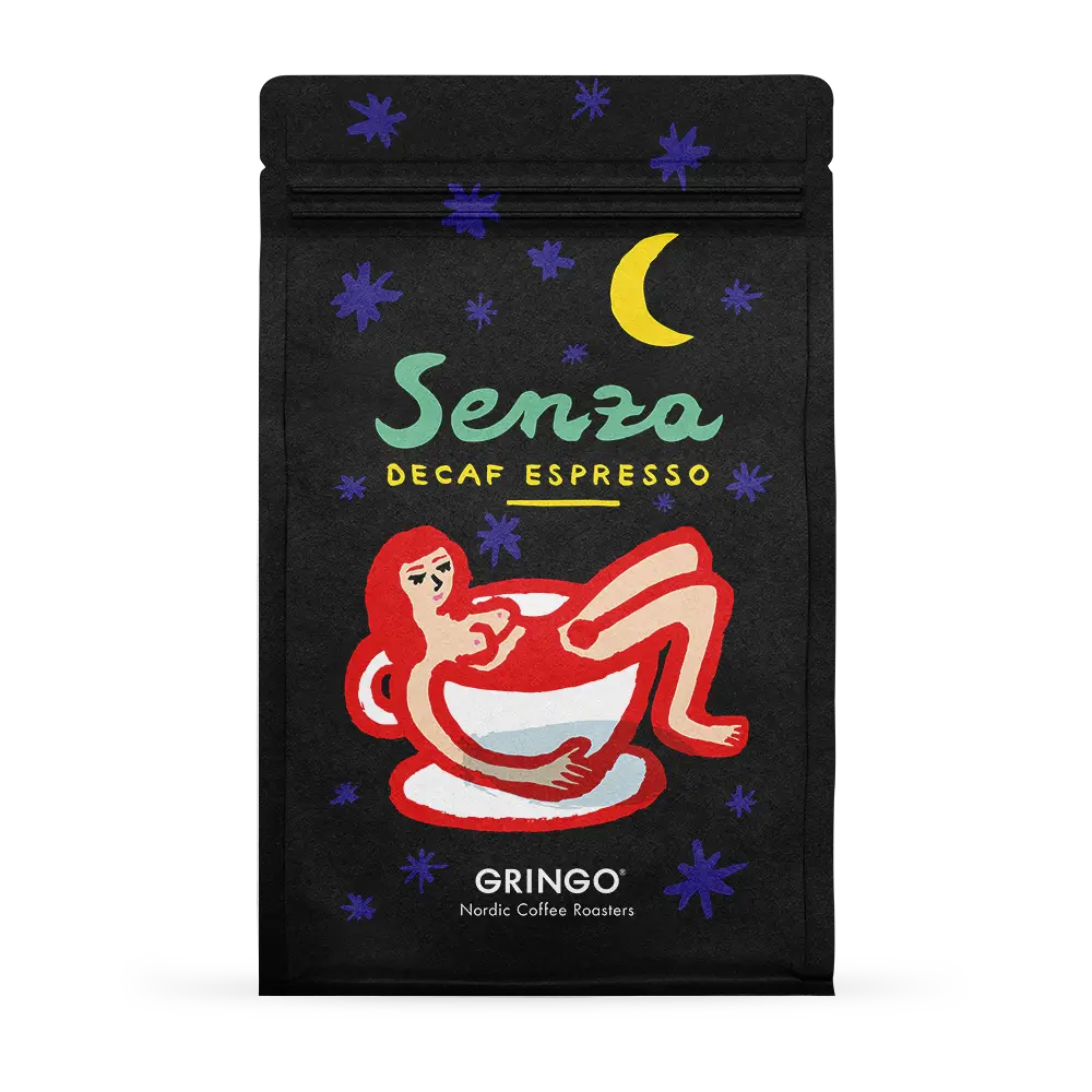 Vår Senza Decaf Espresso har en rik smak utan koffein. Senza kombinerar de bästa koffeinfria bönorna vi kan hitta för att få fram en fyllig karaktär med toner av choklad, karamell, mandel och en mjukt fruktig avslutning.